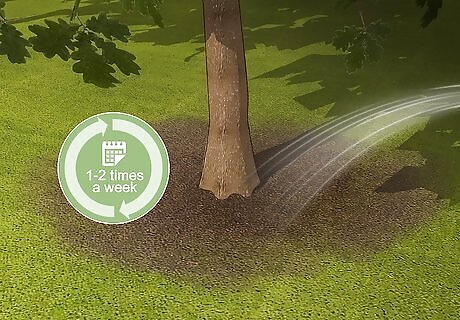 Water trees every 1–2 weeks during construction. Trees located within or near construction sites tend to dry out. Take care of the trees by keeping them supplied with water. Saturate the soil beneath the tree’s canopy with water every 1 to 2 weeks. Most construction takes place during the warm spring, summer, or fall months, when it’s crucial that for trees to have plenty of water. If you’re protecting trees during winter-time construction, you’ll only need to water them once a month.