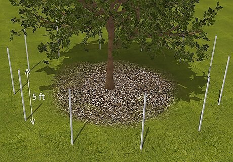 Drive metal posts into the ground around the perimeter of the CRZ. Once you’ve measured the distance of the root system around the trees you’re protecting, you’ll need to build a clearly visible barricade around the tree’s TPZ. Drive 12–15 metal posts into the ground around the CRZ. Each post should be about 5 feet (1.5 m) high and should be driven into the ground by about 1 ft (0.30 m). Purchase metal posts at a large hardware store or home-improvement store.