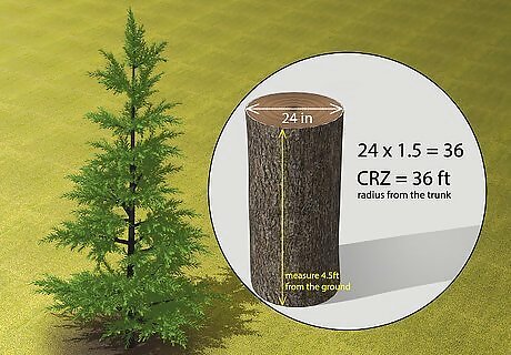 Calculate the critical root zone of narrow-branched trees. Many coniferous trees (e.g., pines) have relatively narrow branches. The roots extend much farther than the branches. Measure the diameter of the tree at 4.5 feet (1.4 m) off the ground. Multiply the result—in inches—by 1.5 to calculate the critical root zone (CRZ) in feet. Measure this distance around the tree and mark the perimeter on the ground. For example, if the tree measures 24 inches (61 cm), multiplying that by 1.5 will equal 36. This is the radius of the critical root zone, and its diameter would be 72 feet (22 m).