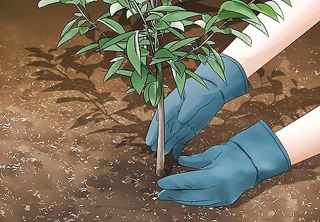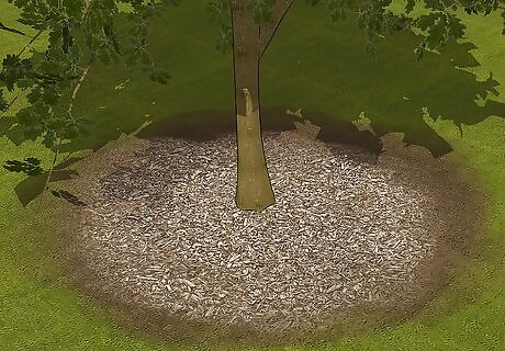 Place wood chips around the tree to protect the soil and tree roots. A thick layer of wood chips will help keep the soil beneath the trees damp and will protect the roots from being crushed if the soil is compacted by construction machinery. This layer should be approximately 4–6 inches (10–15 cm) deep. If the construction lasts for more than 1–2 months, you’ll need to replenish the wood-chip layer. Purchase wood chips at any large home-improvement store, plant nursery, or gardening center.