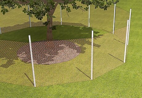 String bright orange netting around the posts to mark off the CRZ. Bright orange netting will advertise a need for extra caution around the area and keep heavy equipment away from the trees. Unroll the netting from the spool around the circumference of the CRZ, outside of the metal stakes. Ask a friend to help, since the plastic material can be heavy! Use plastic zip ties to secure the netting in place around each post. Visit a hardware store to buy as much netting as you’ll need. If, for example, a CRZ is 72 feet (22 m) in diameter, you’ll need about 226 feet (69 m) of netting to encompass the circumference.