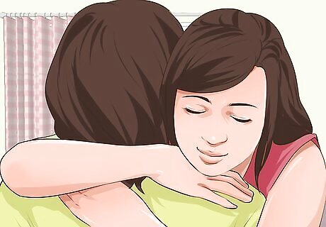 Hug someone. If you have a friend or loved one nearby, give them a hug. Hugging lowers stress hormones and releases oxytocin, which can boost your mood. If you don’t have anyone to hug, that’s okay. Give yourself a quick massage, which can reduce stress hormones and lower heart rate. Try rubbing your shoulders, neck, and temples.