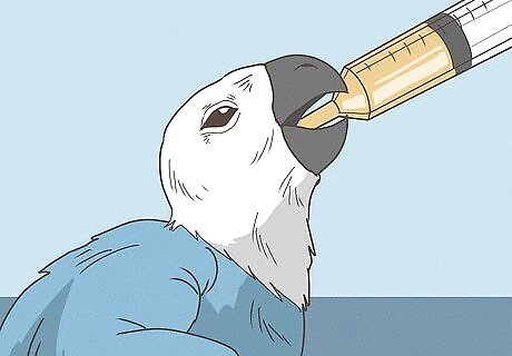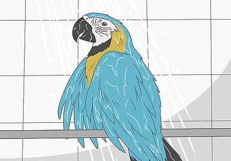 Help with grooming. Provide a bird bath for your bird. Change the water regularly to keep it clean. Take larger tropical birds into the shower or let other birds clean themselves under the faucet. Spray birds with a light mist of water, if they avoid the bath. Birds love bathing and need to groom to stay healthy and happy. Bring your bird to the vet if it needs its beak trimmed. This is also essential for your bird's health.