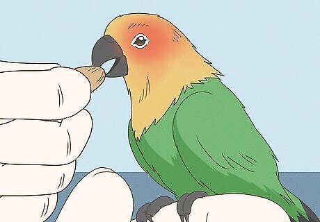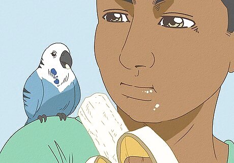 Share food with your bird. Give your bird healthy treats, like fruits and vegetables and eat your own portion of the same food when your bird does. Sit down for a meal with your bird. As flock animals, birds associate sharing food and meals as friendly, social behavior. Cuddle your bird before and after the meal so it associates mealtime with cuddling. Only feed your bird foods that it can tolerate at mealtimes.