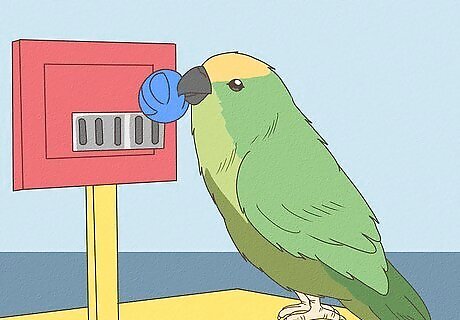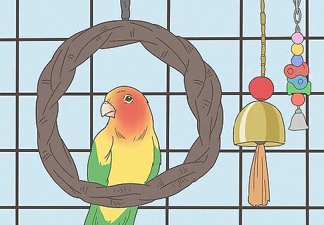 Provide toys. Give your bird toys. Birds enjoy playing and a happy bird will be more affectionate and cuddly. Find toys that are non-toxic and will not be choking hazards, if the bird pulls them apart. Look for toys in the pet store. Consider buying baby toys for your bird, like rattles and blocks. Research which toys your bird breed likes best. For example, Quaker Birds love to lace string around the bars of their cages.