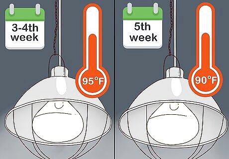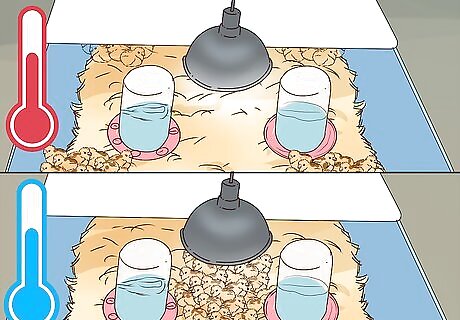 Provide warmth. Without the assistance of an adult mother hen the chicks can get unnaturally cold very fast. A heat lamp is required until your chicks get their body feathers that enable them to keep warm. Keep your heat lamp on for 3-4 weeks at 95 °F (35 °C)the first week and gradually lower the heat by 5 °F (−15 °C) degrees each week until it reaches room temperature. Keep the heat lamp on for the 3-4 weeks your chicks grow.