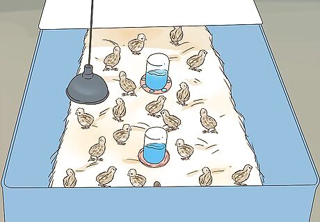 Set up the heat lamp. Baby quail chicks will require heat for 3-5 weeks until they grow their basic feathers. The heat lamp should be set at 95 °F (35 °C) for the first week and gradually lowered by 5 °F (−15 °C) degrees each week until it reaches room temperature and is no longer needed.