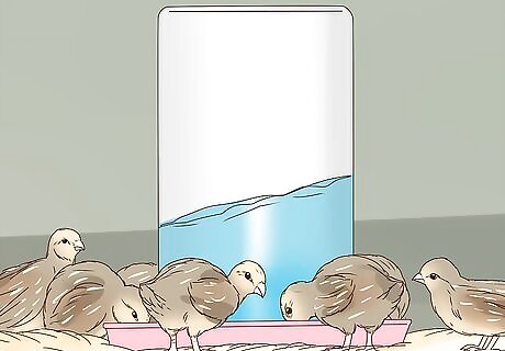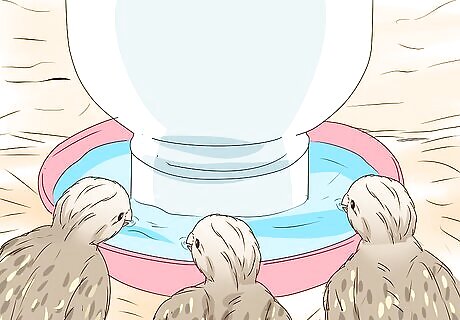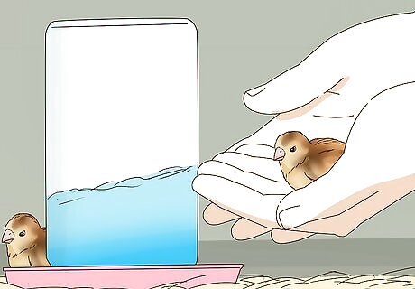 Supply with clean water. At a young age you should ensure the drinking station is safe and clean for your birds. Young chicks can easily drown, so it's important to provide a shallow bowl of water no bigger than the chicks themselves. It's also a potential issue that the chicks will not know how to drink; in this case it's your job to teach them. Provide shiny pebbles in the bowl to encourage the chicks to drink or tap your fingers in the water dish.