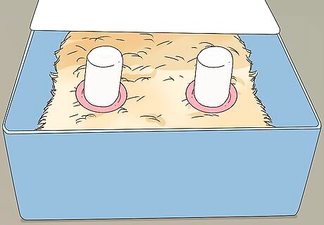 Transfer your chicks to their brooder. This will be their housing unit for 3-5 weeks until your chicks grow feather and can be transferred outside. The brooder should have the basics in it such as bedding, food and water.