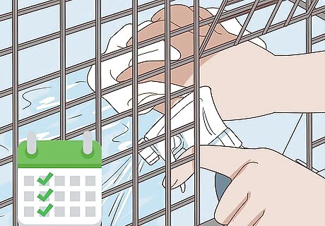 Clean the cage weekly. Quail poop is notorious for causing issues with diseases and infections, so it is important for your to clean it frequently; especially when it builds up. This includes old hay/bedding, rinsing down the cage and scrubbing the feeding/drinking stations.