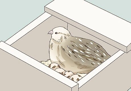 Furnish with nesting boxes. Your hens will require a comfortable place to lay their eggs. Chicken nesting boxes will be too big to provide comfort to your quails so it is advised to make your own or use a aviary bird box. Fill the box with wood shavings, hay and a few nesting materials. Quail naturally lay eggs on the ground in a nest.