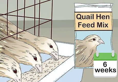 Switch over to an adult feed mix at six weeks. Get your quail off of crumbles and onto a calcium egg-laying enriched feed. The pellets/crumbles should continue to have over 20% of protein and for the hens; a calcium-enriched brand.