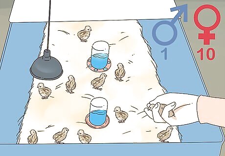 Know where to source your chicks. Quail chicks can be purchased from reputable breeders or a farm store. You can also source them online via craigslist or gumtree. You can purchase fertile eggs often the same ways or via mailing. Raising quail through eggs are considered a cheaper way as eggs fetch a cheaper price and are sold in bulk. However, you will need to consider the incubator prices. Unlike baby chickens, quail chicks cannot be sexed.
