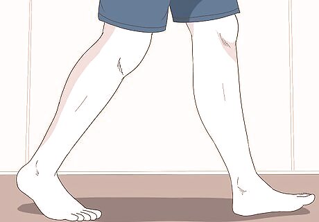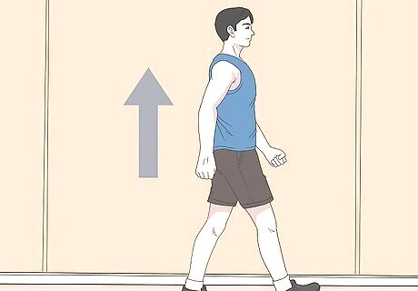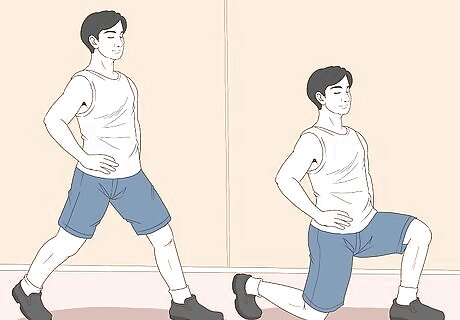 Do lunges to strengthen your quad muscles. Stand with your feet straight ahead and reach one foot back behind you. Bend both of your legs until your back leg is at a 90° angle, then slowly straighten up again. Repeat a set of 10 lunges on each leg once a day. Lunges build up the muscles surrounding your knees, which will take pressure off of them as you walk. Doing too many lunges can strain your knees. Don’t overdo it, especially when you first start out.
