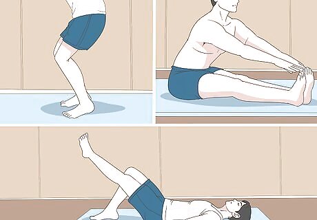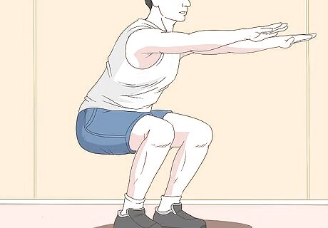 Do squats to strengthen your legs. Stand with your feet shoulder-width apart and your toes pointed forward. Slowly bend your knees until you reach a sitting position. Slowly straighten your legs until you are standing up again. Repeat this movement 10 times once a day. Make sure your knees do not go out to the side or you could strain them.