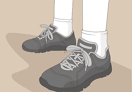 Wear comfortable shoes that fit well. Walking shoes should be flexible and have strong soles. Buy shoes that are your size and that have good arch support. Avoid stiff or ill-fitting shoes.Tip: Walk around for about 30 minutes before you try on a pair of shoes. Walking swells your feet slightly, and you should buy a shoe that will accommodate that. Avoid wearing flip-flops, since they can damage your feet or put you at greater risk of falling.