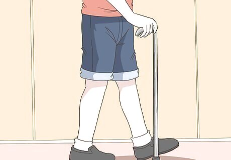 Use a walking cane to decrease the weight on your knees. Walking canes or Nordic sticks are helpful if your knees are damaged from stress or arthritis. Walk with a cane on your stronger side and step it out in front of you as you walk on your weaker side. Make sure to get a cane that comes up to your wrist so that you don’t have to bend over to reach it. You will probably only need a 1-point on the ground walking cane to start. If you need help with your balance as well as knee pain, try a 3-point or quad-point cane. Nordic walking sticks are also great for reducing knee pain. These are light-weight aluminum poles that you carry in both hands and use to push yourself forward as you walk. You can get Nordic sticks at many sporting goods stores.