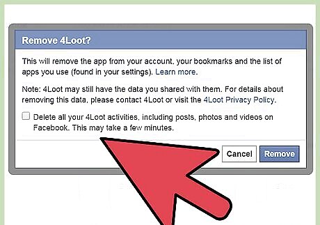 Select the option "Remove App" or "Remove Game." In the drop-down menu, remove the game when prompted. This will open a new popup window, asking to confirm, and a box may also be checked to remove app posts from Facebook as well. Click the "Remove" button to remove it. There will be a warning popping up asking to confirm you're deleting the app/game.
