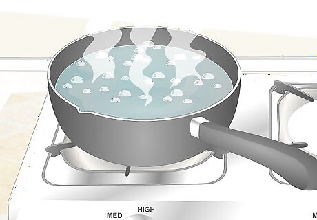 Boil 3 cups (710 mL) of water in a kettle. A wine bottle holds about 3 cups (710 mL) of liquid, so use this much water for each bottle you want to remove the label from. Pour the water into a kettle and bring it to a rolling boil. If you boil water in a saucepan, it will be much harder to pour it into the bottle later.