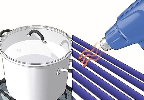 Heat the vinyl strap. This is done to soften it. There are at least two possible ways to achieve this satisfactorily: Use boiling water to heat it. Using a hot plate or other heat source, boil a large pot of water. Once the water has come to a boil, insert several straps. Reduce the heat so the water remains hot but not boiling. Allow the straps to stay in the water at least two minutes, although leaving them in longer will not hurt them. Use a heat gun. Move the heat gun around frequently; do not allow it to rest at one place. Thirty seconds of moving it around the strap and it should be heated enough to use.