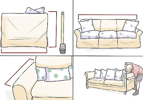 Measure your sofa. A “slipcover” is a commercially-made cover for your sofa. In order to purchase the right one, you will need to measure your sofa. Using a tape measure, record the width and length of your couch, as well as the length of the arms. Additionally, you should look for any labels on your sofa. If you can determine the manufacturer and/or specific style of your sofa, you may be able to find a slipcover made especially for it. It can also be helpful to take a photo on your cell phone. You can show this image to a retail employee, and they may be able to help you select the right product.