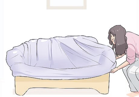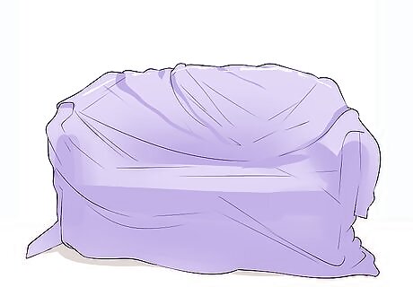 Drape a sheet over your sofa. When covering your sofa with a bed sheet, you basically have two options. First, if you have a large enough flat sheet, you can drape it over your entire sofa and tuck it in all over. You second option is to use an entire set of sheets to cover different parts of your couch. You may need to experiment with different sheet sizes to get the right fit. Choose a sheet with a color or print that the original sofa fabric does not show through. Opt for sheets made of durable fabric. For instance, though silk may look nice, it will slip around. Remove all of the cushions and lay your flat sheet over the base of the sofa. Tuck it in as best as you can. Take your fitted bed sheet and secure it over the cushions of your sofa. Use pillowcases to cover the arms of your sofa.