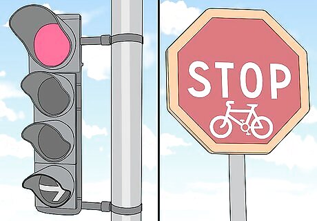 Pay attention to traffic lights and signs. Just like cars, you have to stop at red lights and stop signs, as well as yield to oncoming traffic at times. Following these rules is important because it gives drivers a sense of what you're going to do next. For instance, if you come up to a 4-way stop with a car already there, the driver expects you to stop since it was there first. If you just run the stop sign, you risk getting in an accident with the car.