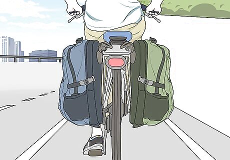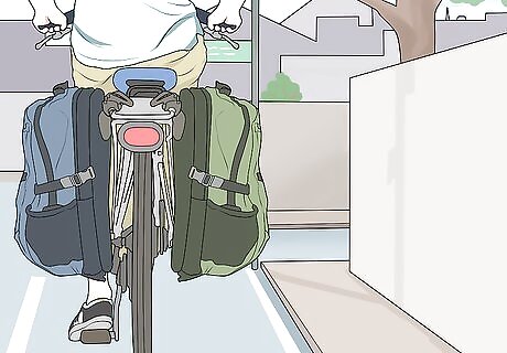 Place your cargo in a backpack to keep it out of the way. Make sure you fasten it to your back so it doesn't shift around while you're riding. Alternatively, you can mount specially designed bike bags on your bike. These bags are more comfortable to ride with than a regular backpack. Avoid dangling loose bags from your handlebars or other parts of your bike since they could get caught in the wheels.