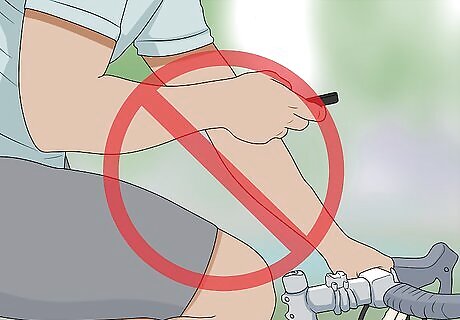 Avoid distractions while on your bike. If you're distracted, you may not notice a car coming in your path. Turn off the music and put your phone away while you're on your bike. That way, you can focus your whole attention on the drive. Just like in a car, don't try to text while cycling. It could end badly! Similarly, don't talk on the phone, as that is a major distraction, even if you have earbuds in.