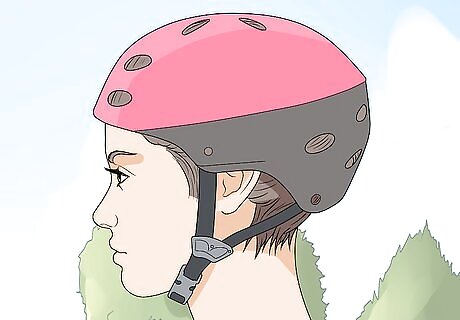 Wear a helmet that fits properly to protect your head. Make sure the helmet fits snugly but covers your head down to your ears. Push it forward so you only have 2 fingers between the front of the helmet and your eyebrows. Adjust the side straps so the bottom part of the "V" fits just below your ears. Once you click the strap under your chin, tighten it to make sure you have a secure fit. A helmet can save you from serious head injuries if you are in an accident.