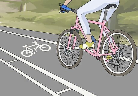 Ride in bike lanes if they're available. Some roads will have lanes specifically for bikes, and you should always use them if they are available. Otherwise, ride on the main road in one of the primary lanes. In most areas, you have the right to use the road, and cars must go around you. Avoid riding on the sidewalks, as you can surprise drivers at intersections, leading to accidents.