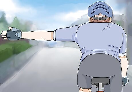 Use hand signals when changing lanes or turning. Since you don't have a turn signal on your bike, you have to use hand signals. To turn left, put your left arm straight out to the left. To turn right, you can either put your right arm straight out or bend your left arm at the elbow with your hand pointing up. To show you want to stop, bend your left arm at the elbow with your arm pointing down.