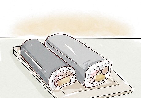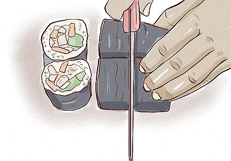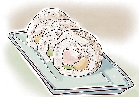 Cut and serve the sushi roll. Start by cutting it in half. Then, cut each half into thirds with your chef’s knife. Place the sushi on a serving tray with soy sauce, wasabi and pickled ginger. Serve the sushi roll right away in order to ensure safe consumption.