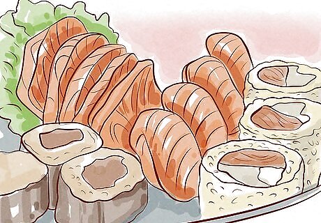 Choose sushi with low-mercury fish. If you like to eat fish more than twice per week, it is important to choose sushi made from low-mercury fish. Albacore tuna, swordfish, shark and marlin are among the fish with very high concentrations of mercury. Tilefish, mackerel and mahi-mahi also have high mercury levels. Instead of high-mercury fish, order raw-fish sushi with lower levels of mercury. For instance, salmon, eel, crab and clam have low levels of mercury. If you are pregnant or nursing, it is especially important to avoid sushi with high levels of mercury.