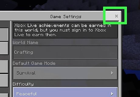 Exit the Settings menu. Tap X in the top-right corner of the screen. In Peaceful mode, hostile and neutral monsters will no longer spawn, meaning that your only enemies will be llamas and gravity. Environmental dangers (e.g., lava, drowning, etc.) will still kill you if given the chance.