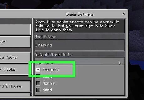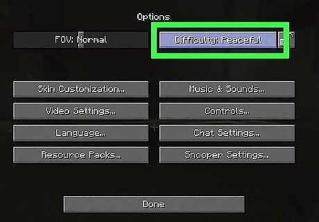 Exit the Options menu. Click Done at the bottom of the page, then click Back to Game to return to your game. In Peaceful mode, hostile and neutral monsters will no longer spawn, meaning that your only enemies will be llamas and gravity. Environmental dangers (e.g., lava, drowning, etc.) will still kill you if given the chance.