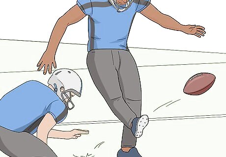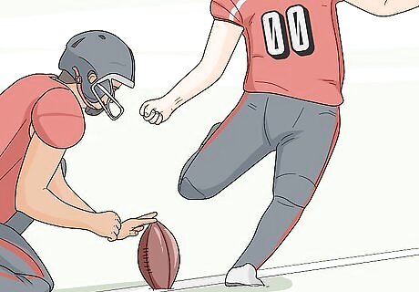 Call a special field goal play to send the kicker onto the field. A field goal kick requires a different formation known as special teams. That includes the kicker, a holder, and a motley of players who specialize in keeping the kicker safe from the defensive team trying to block the kick. There are different scenarios where a field goal is an appropriate play to call. If it’s the fourth down, you may want to take a chance at kicking a field goal instead of punting in order to try to score. The last few seconds of a game may be a good time to call a field goal in order to score enough points to defeat the opposing team.