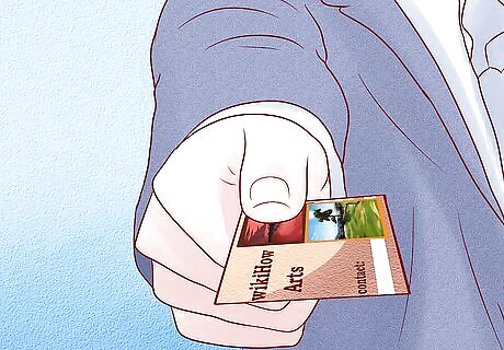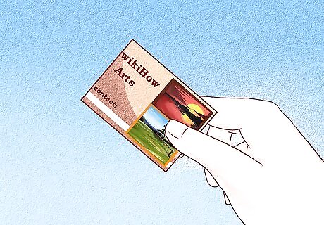 Make business cards and promotional fliers. Distribute these items around local art galleries and fairs. Ask local vendors if you can leave some of your business cards with them or post a flier on their community bulletin boards. Consider contacting vendors that would have the appropriate clientele for your artwork. Also advertise at local restaurants and stores. This will allow you to catch people of all interests.