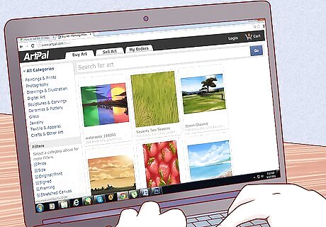 Sell your art online. In the digital age, most business transactions are moving from the street to the computer. Visit the following websites for showcasing your art easily and with little cost. Artpal.com is a free gallery for selling art. Their advertised products range from sculptures to jewelry, catering to a wide spectrum of artists. Artpal offers free membership, has a user-friendly website, and offers many features for selling your art online. Advertise your art on popular online merchants like Amazon or eBay. You'll only have to pay a shipping fee, and you'll get to appeal to a wide range of consumers. If enough people buy your work, your items may be linked to other popular items and listed as "People who bought this, also bought..." Make an offer on Craigslist.com. Craigslist advertises a broad range of things, from job opportunities to used electronics. Showcasing and selling your pieces to casual consumers will help you build confidence and turn a profit as you seek to gain exposure locally.