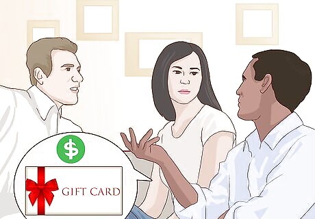 Arrange a gift card swap. If you'd prefer to swap the gift cards among people you know, you can arrange a gift card swap. This could be an informal gathering at your home where you invite friends and family over to swap gift cards they no longer want or have not yet used. Have everyone write down the dollar amount of their gift cards and swap amongst themselves. Another option is to set up the gift card swap like an auction, where people bid on different gift cards or offer to swap their gift cards for someone else's gift cards. You can have people offer several gift cards for the price of one card as part of the swapping rules. This may be important if the gift card someone wants is to a more desirable place than the cards they have and want to swap up.