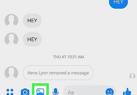 Tap the photo icon. You’ll find this between your chat field and microphone icon. The gallery will slide up from the bottom. Tap the 3x3 grid icon in the lower left to expand your gallery screen. Tap the Gallery menu to see other media locations, including other video or photo-editing app folders.