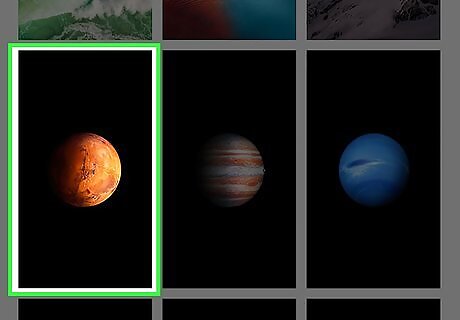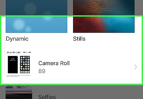 Select a photo album. You have a few different albums from which you can choose your wallpaper photo: Dynamic - Apple-created screensavers. Stills - High-definition still photos from Apple. Live (iPhone 6 and up) - Short, high-definition video clips made by Apple. All Photos (or Camera Roll) - Any photo that can be used as a wallpaper appears here. Other albums - Custom-made and app-created albums will appear below the All Photos/Camera Roll section.