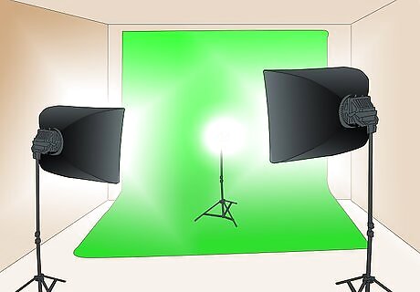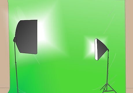 Set up your three-point lighting. The best way to make sure your lighting is even, and make green screen filming easier down the road is to set up three-point lighting. To do that, have one light facing the subject, and then organize the other two lights so they form a triangle. This enables you to provide illumination from the sides, and reduces the amount of shadows your lights create!