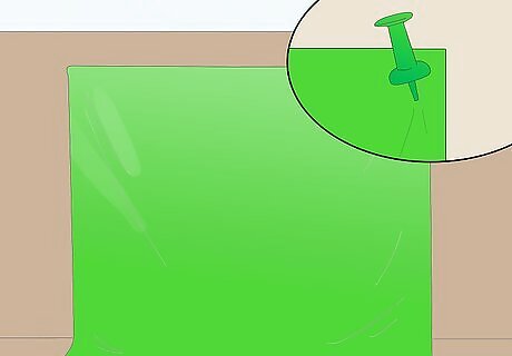 Hang the green screen material on a wall. Use tacks or pins to anchor the green screen material to the wall. Smooth out any wrinkles on the cloth or paper keeping the material taut when hanging it, pulling it as tight as possible. Make a distinct crease where the green screen meets the bottom of the wall, pinning down with tacks, too. If the green screen is not pulled tightly there will be shadows throughout the screen and the image you use in post production will be distorted. If you do not plan to record or photograph your subjects lower body, you will not need to let the green screen fall to the floor.