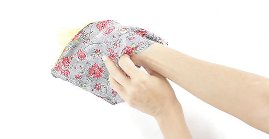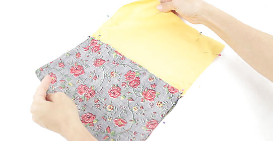 Insert your hand through the gap and pull the pouch inside out. Find the gap that you left in the lining and put your hand through it. Grab the outer fabric with your hand and pull it back through the gap. Keep moving the fabric until the pouch is inside out. Use your fingers to push into the corners so the edges of the pouch are sharp. You should also do this for the lining corners to make it easier to sew the pouch shut.