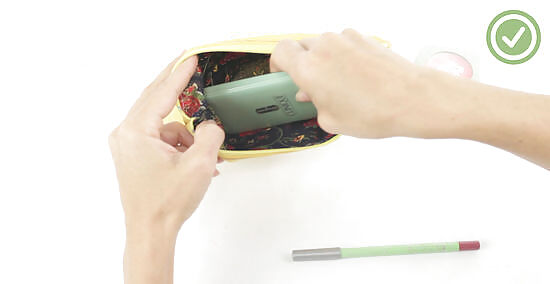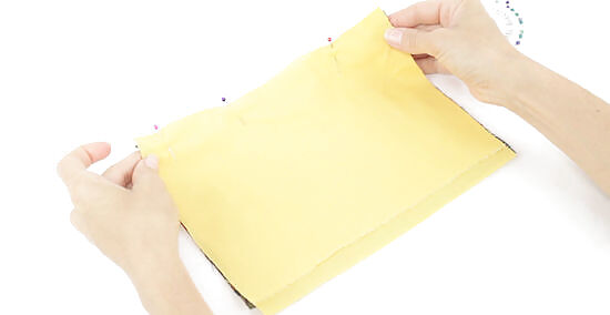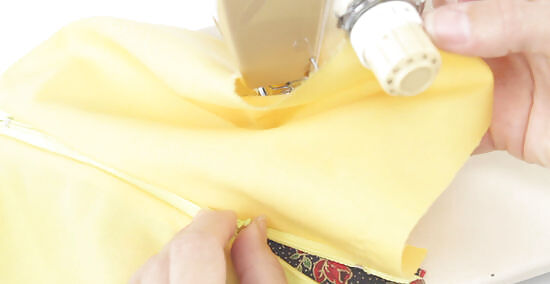 Clip the zippered ends of the pouch. Turn the zipper so the zipper teeth are facing the lining and not the outer fabric. Then use small clips or pins to hold the ends of the zipper in place. Pointing the zipper teeth toward the lining will prevent the zipper from puckering or looking pinched.