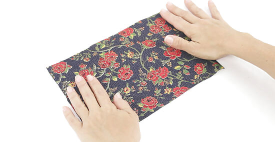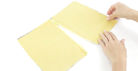 Unzip the zipper and open the pouch like a book. Once you've unzipped the zipper, bring the 2 outer pieces of fabric together. Lift these up with 1 hand and use your other hand to grasp the 2 lining pieces. Then lay the pouch flat so the lining pieces are on 1 side and the outer pieces are on the other side. It's important to unzip the zipper now or you won't be able to open and close the zipper after you finish sewing the pouch.