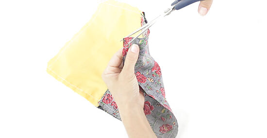 Cut the corners and trim the ends of the zipper. Use fabric shears to cut each corner without cutting into the stitching. Once you've clipped each corner, remove the tiny triangular pieces of fabric. Then trim off the bulky ends from the zipper without cutting into the stitching. Trimming the zipper ends will help the zipper lie flat.