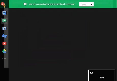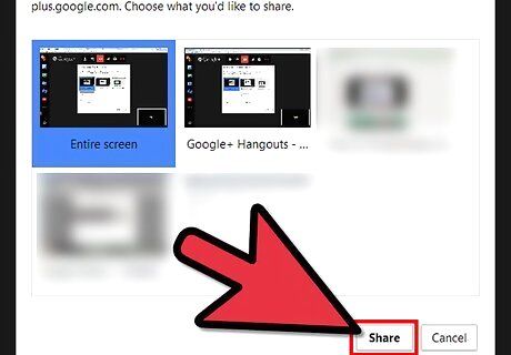 Find and click the screen you'd like to share with the group. Any actions you perform with your mouse and keyboard will be able to be viewed by the other members who have visited the Hangout. Any window that is open is able to be shared, including your computer's desktop, or the items that are being shown in Fullscreen mode.