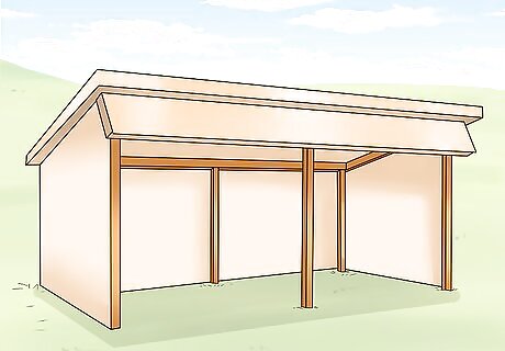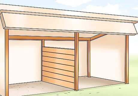 Build a three-sided shelter to protect your horse from the elements. At a minimum, a horse should have access to a three-sided shelter with a waterproof roof. To provide maximum protection against drafts, place the structure against the prevailing winds in your area. For example, if winds typically blow from the north and west, position the shelter so the open side faces the southeast. The three-sided shed should be big enough to fully cover all the horses that you keep in your field. The horses should also be able to turn around while still remaining protected.